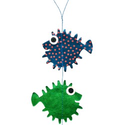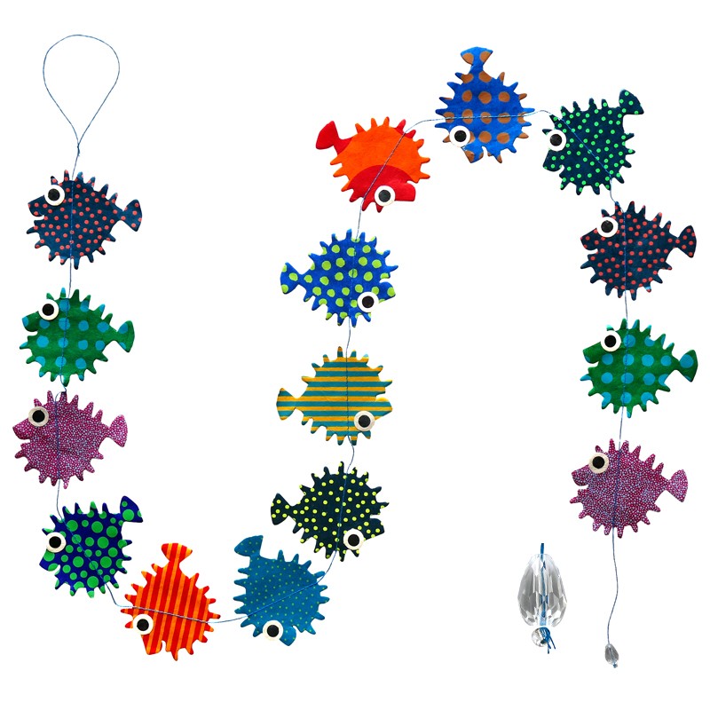 Puffer Fish Garland – approx. 1.50 m. Stitched silhouettes in printed Lokta natural fiber paper with collage. Finished with a faceted glass bead. Handmade in Nepal.