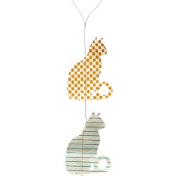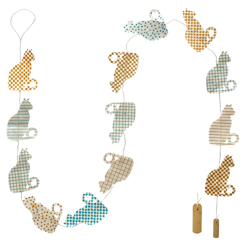 Sarabhai Cat Garland – approx. 1.50 m. Stitched silhouettes in printed Lokta natural fiber paper. Finished with a bamboo stick. Handmade in Nepal.