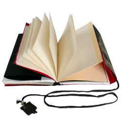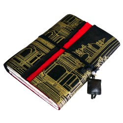Pilgrim Journal Stupa - 16x21cm approx. - 272 pages. Silk tie and leather amulet. Lokta paper softcover, screen-printed in gold color - Handmade in Nepal. With its pages of different papers and its large colored Lokta sheets, this generous notebook is ready for many journeys: poetry, graphic design, collages...