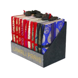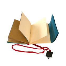 Shangrila Amulet Journal – 11x16cm approx. - 162 pages. Silk tie and leather amulet. Lokta paper softcover, screen-printed in gold color - Handmade in Nepal. With its 52 pages each of white laid paper, kraft paper, and cream laid paper, and its large colored Lokta sheets, this compact and lightweight notebook is particularly well-suited for writing.