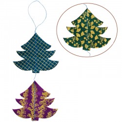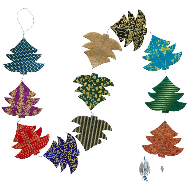 Guirlande Sapins Tantra - 1,50m env. Silhouettes cousues en papier de fibres naturelles de Lokta imprimé or. Fait main au Népal.