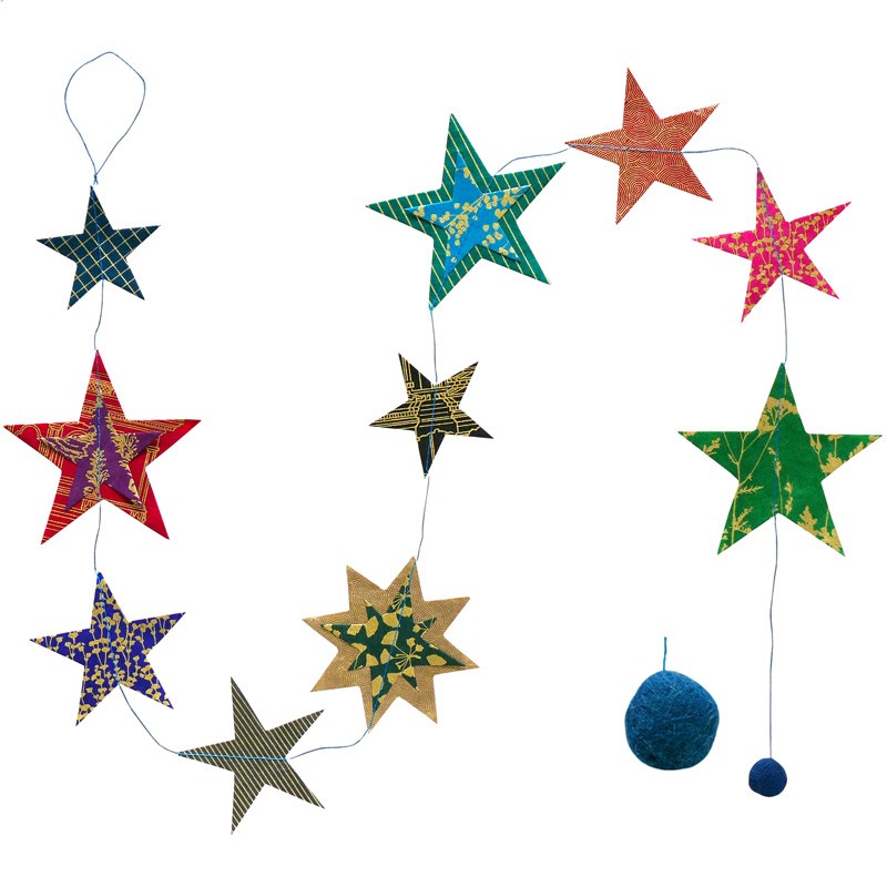 Guirlande Etoiles Filantes Tantra - 1,50m env. Silhouettes cousues en papier de fibres naturelles de Lokta imprimé or. Fait main au Népal.