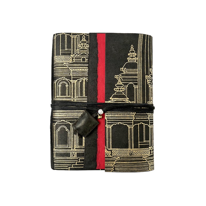 Carnet Pèlerin Stupa – 16x21cm env. - 272 pages de différents types de papier. Lien et amulette cuir. Couverture fine en Lokta imprimé or. Fait main au Népal.