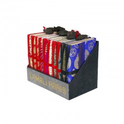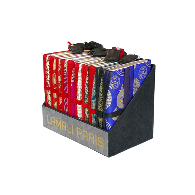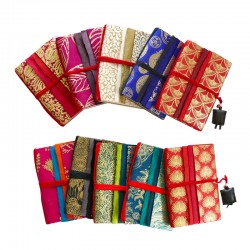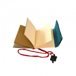 Carnet Amulette Shangrila – 11x16cm env. - 162 pages de différents types de papiers. Lien de soie et amulette cuir. Couverture fine en Lokta imprimé or. Fait main au Népal.