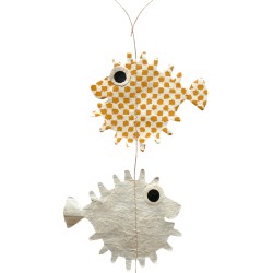 Guirlande Poisson-Globes - 1,50m env. Silhouettes cousues en papier de fibres naturelles de Lokta imprimé et collage. Terminée par une perle de verre facettée. Fait main au Népal.