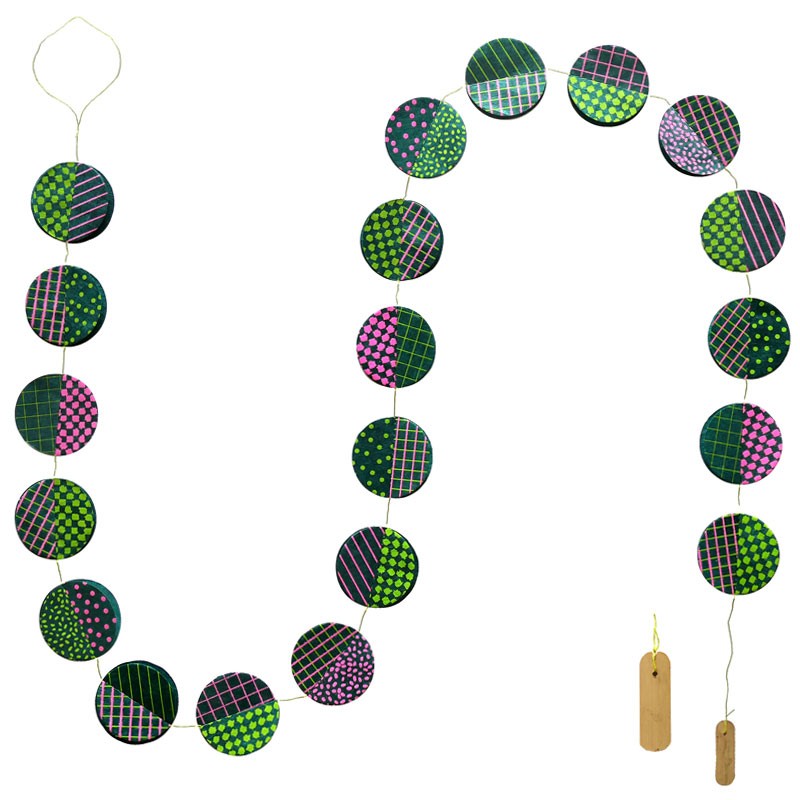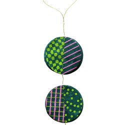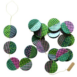 Guirlande Petits Ronds-Doubles Sarabhai - 1,50m env. 3D. Silhouettes cousues en papier de fibres naturelles de Lokta imprimé. Terminée par un bâtonnet en bambou. Fait main au Népal.