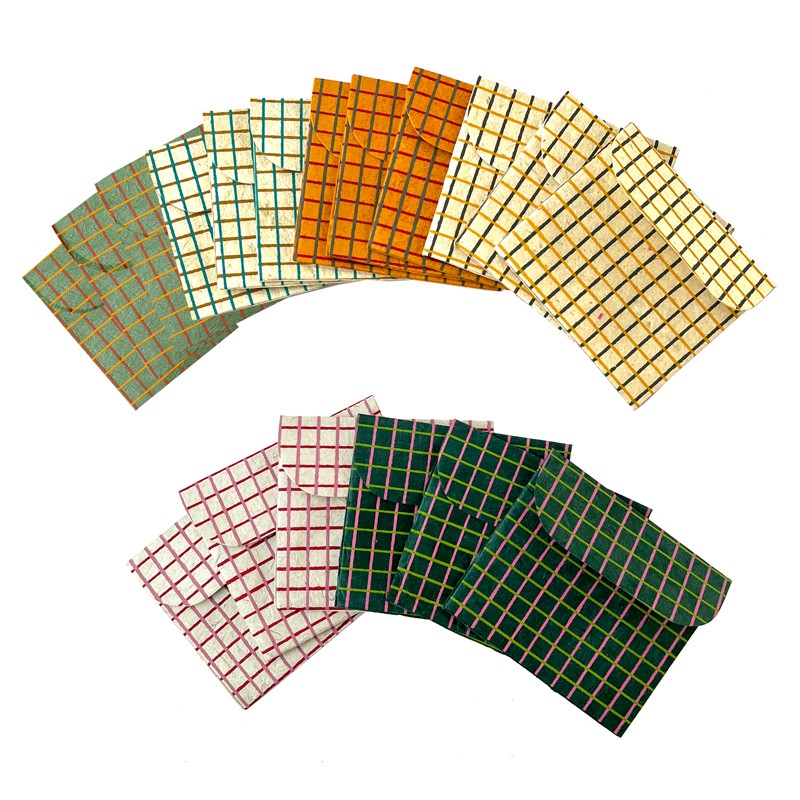 Mini-Enveloppe Sarabhai – 6x7cm env. Papier de fibres naturelles de Lokta sérigraphié 2 couleurs et feuillet de papier vergé blanc. Fait main au Népal.