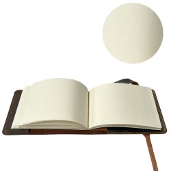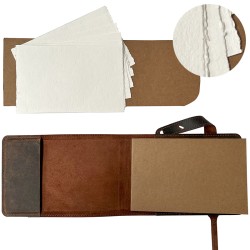 Carnet Cuir Odyss 11,5 × 18 cm – Couverture en cuir, composé d’un carnet de 120 pages (125 GSM) cousues et de 6 cartes (300 GSM). Papier fait main, couleur ivoire, 100 % coton. Format paysage. Fabriqué à la main en Inde.