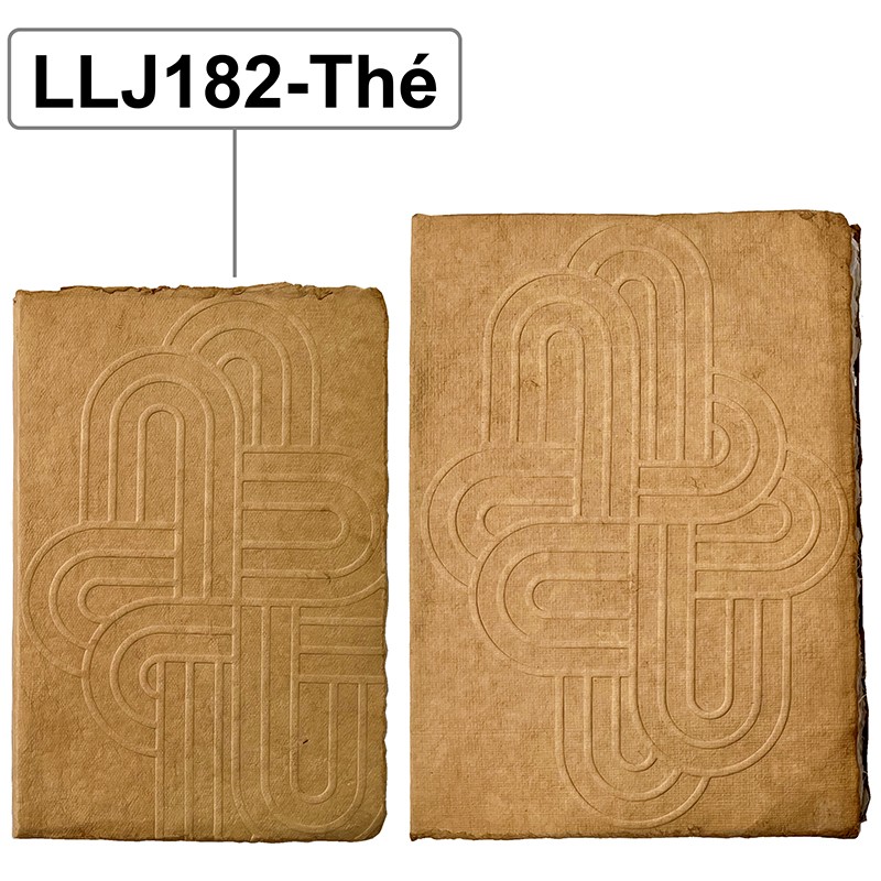 Carnet Mandana 12x18cm - 72 pages cousues de papier blanc, 100% chiffon, fait à la main. Couverture thé papier épais à motif gaufré. Fait main en Inde.