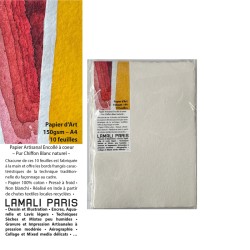 Disponible du format A6 aux grandes feuilles, ce papier de 150 g/m² est fabriqué à la main selon la technique traditionnelle à la cuve, où chaque feuille est formée individuellement sur moule en bois.